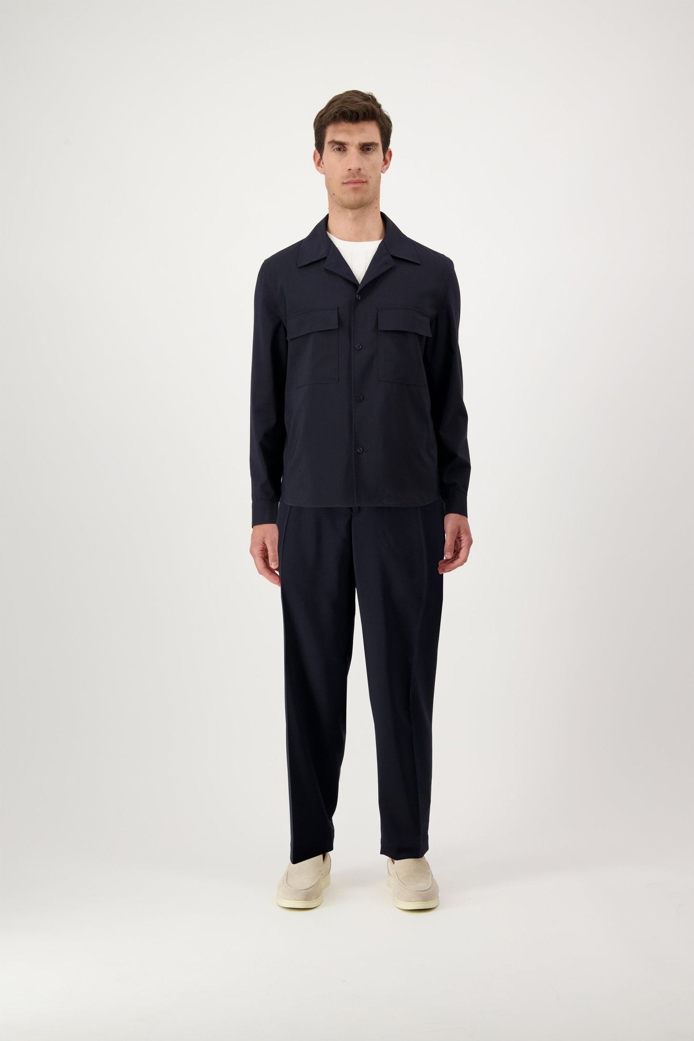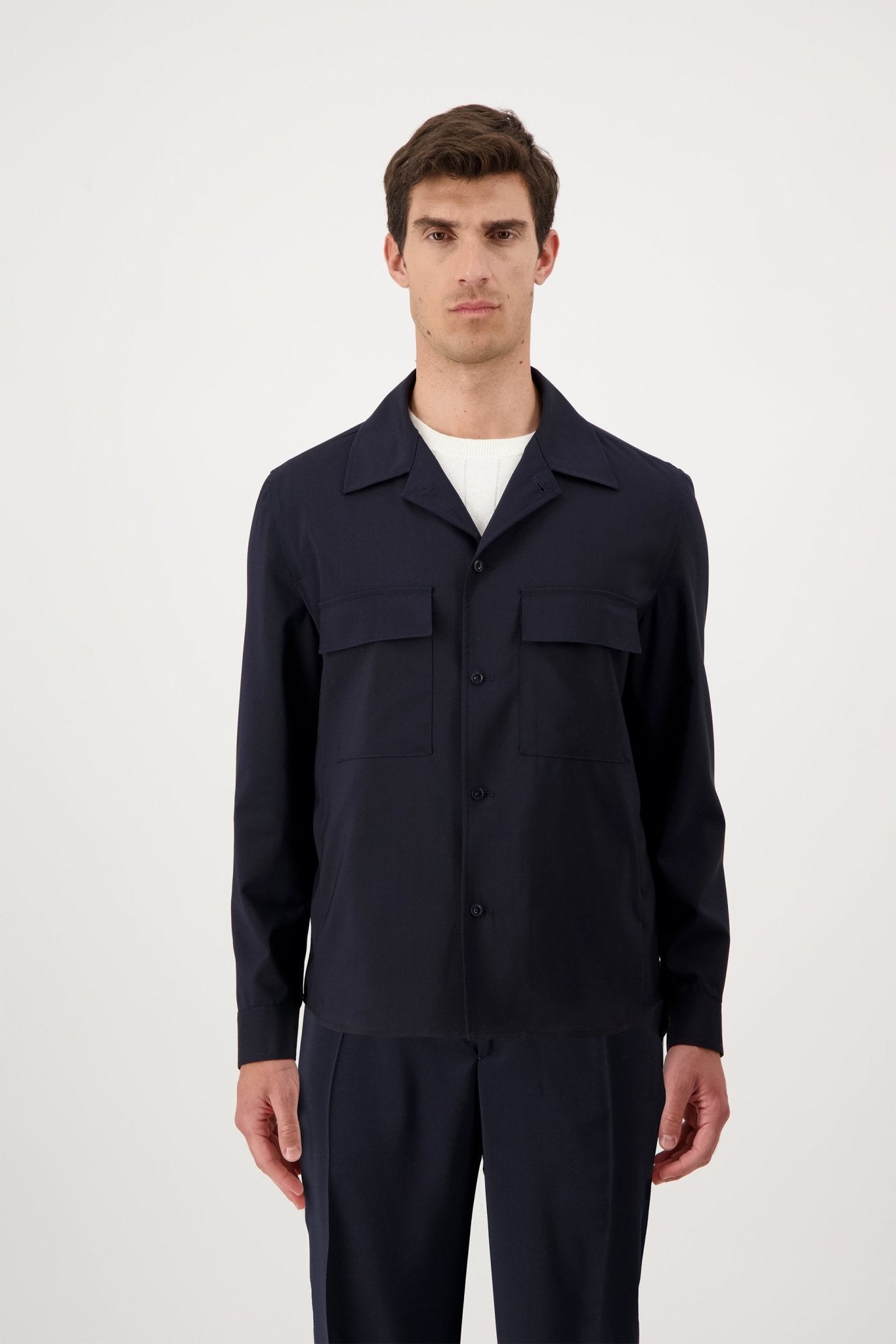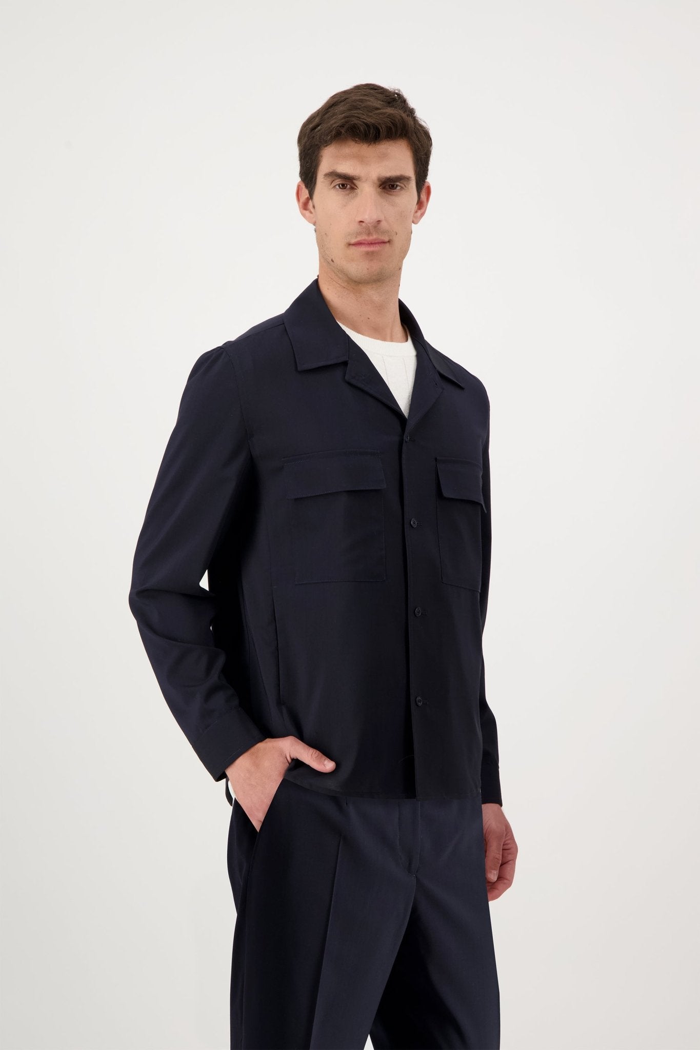 Overshirt with six buttons and two patch pockets. The model is 188 cm tall and wears a size 50.