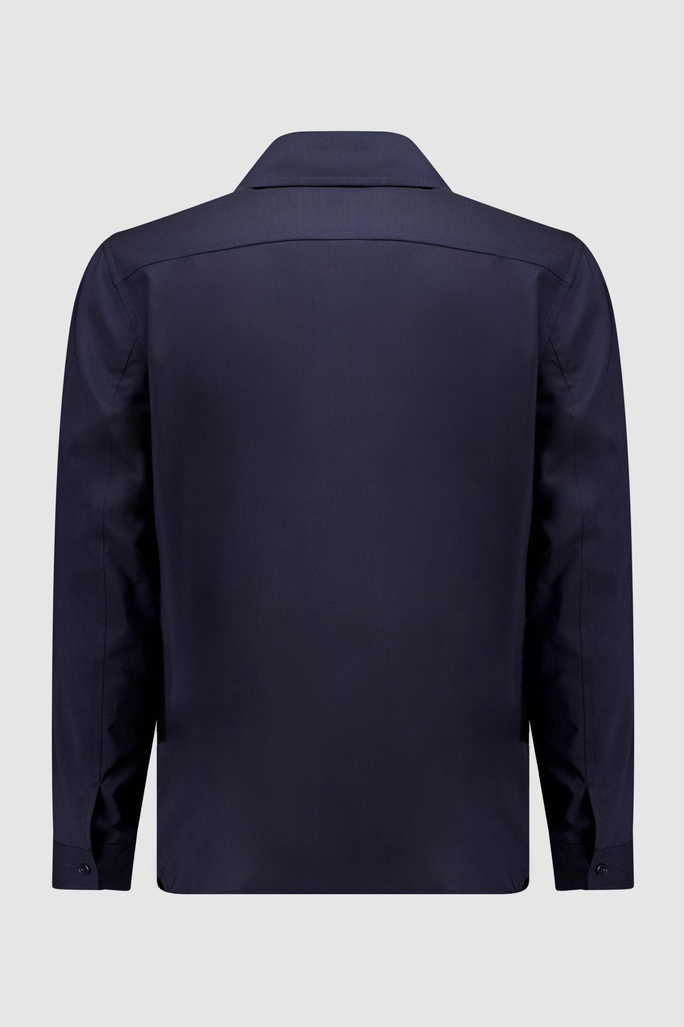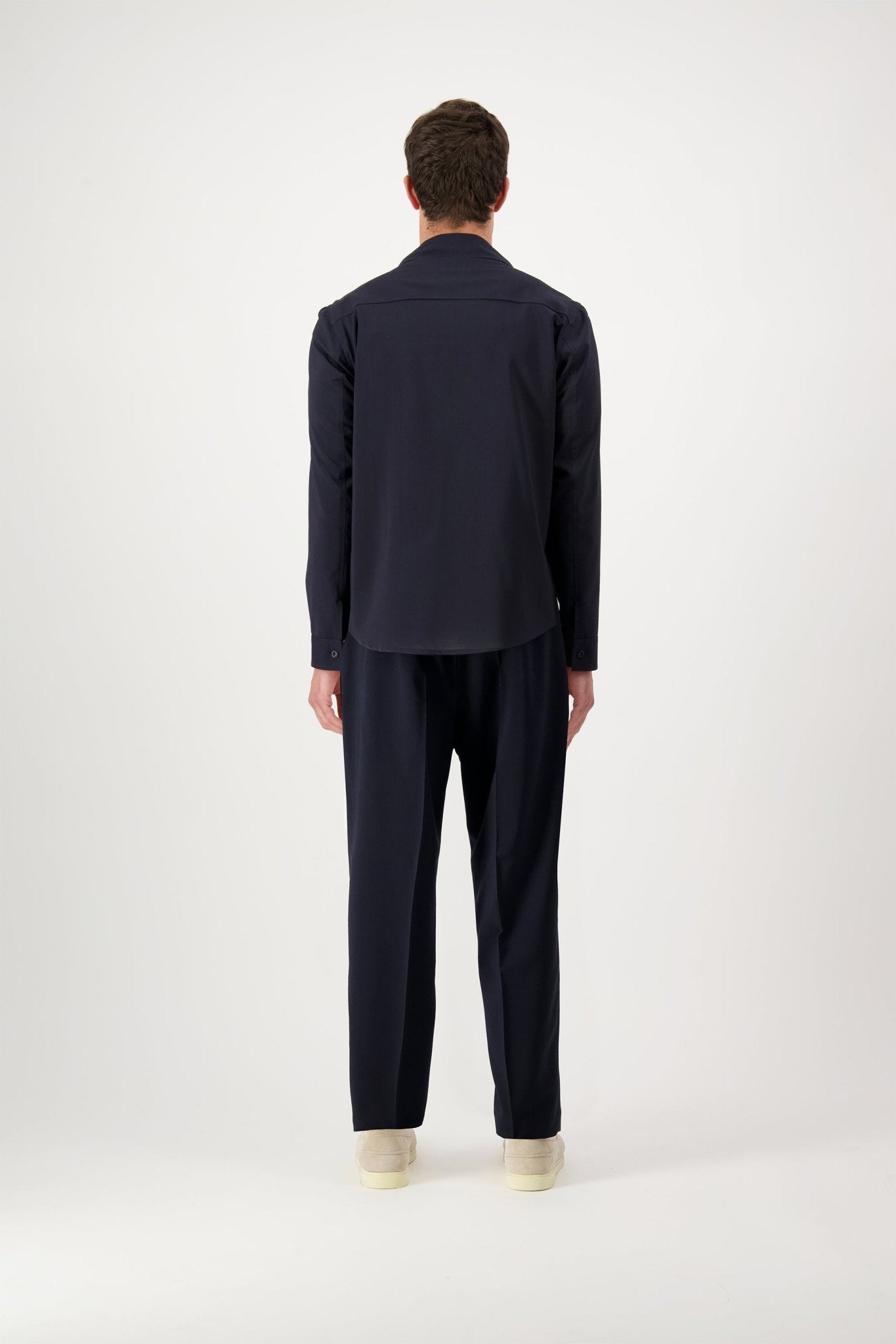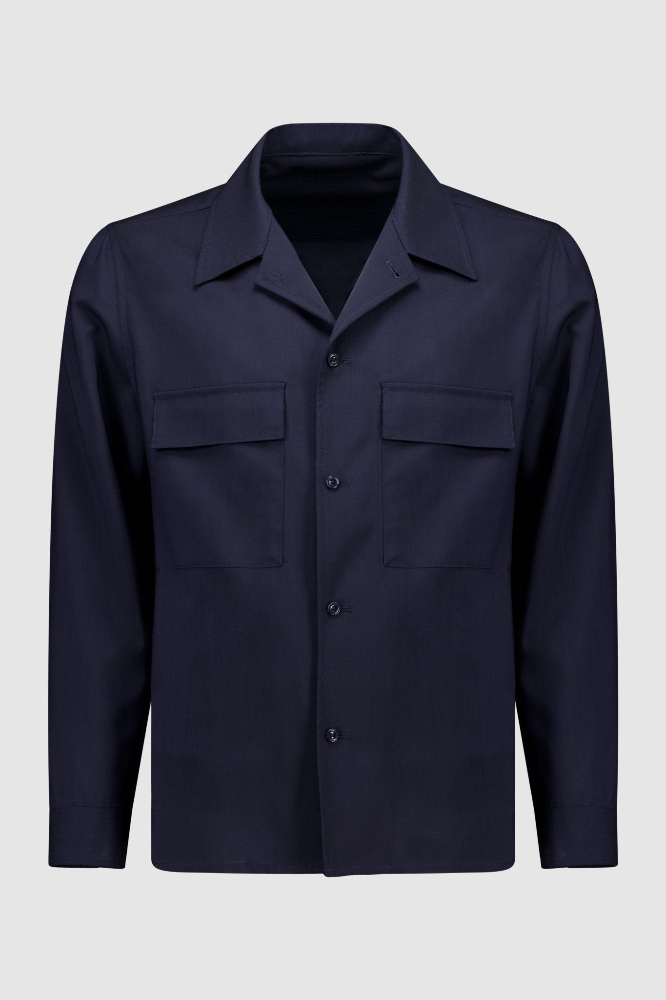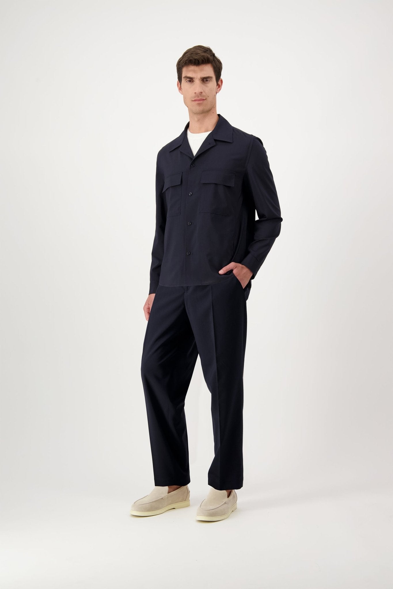 Overshirt with six buttons and two patch pockets. The model is 188 cm tall and wears a size 50.