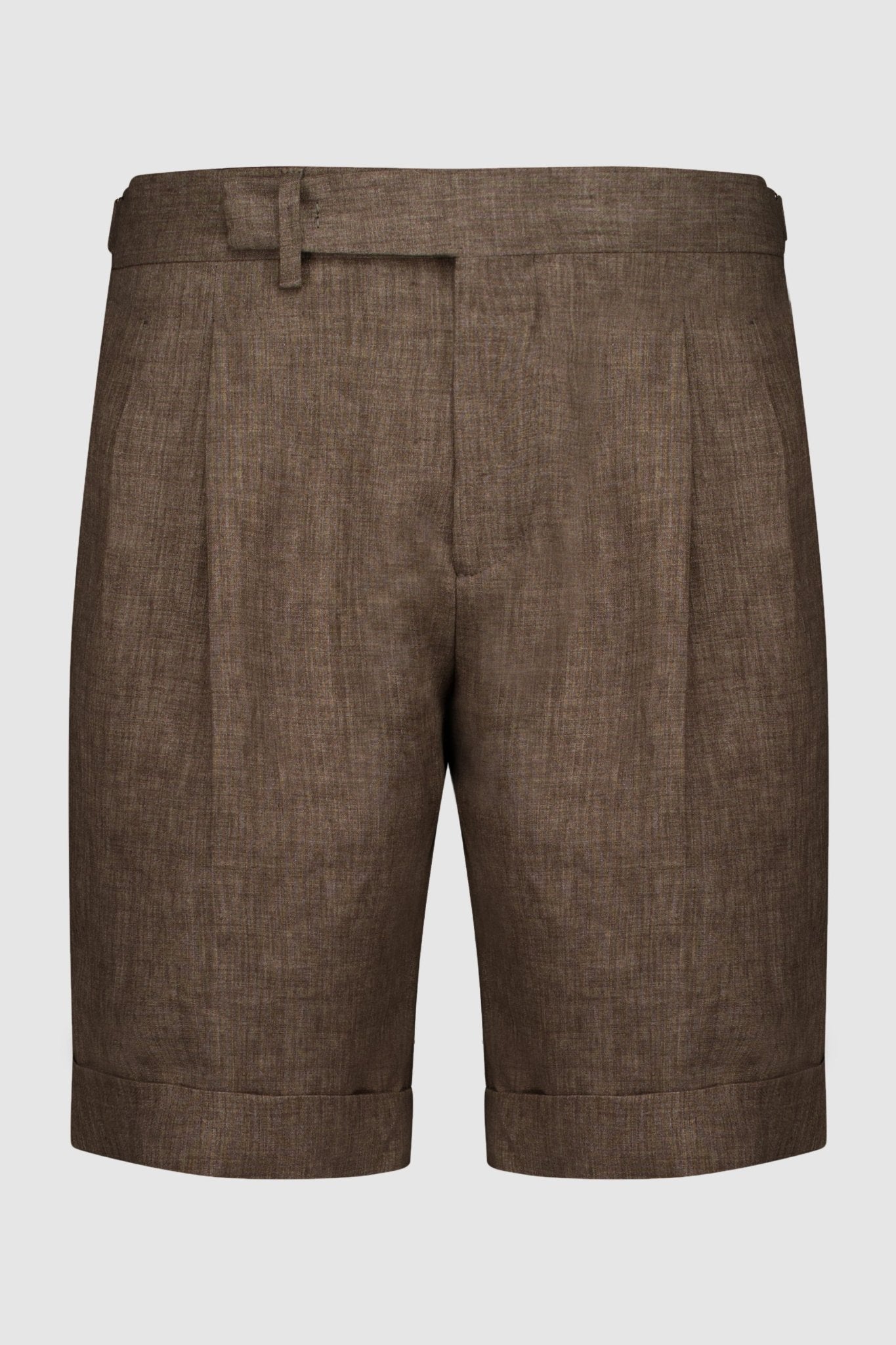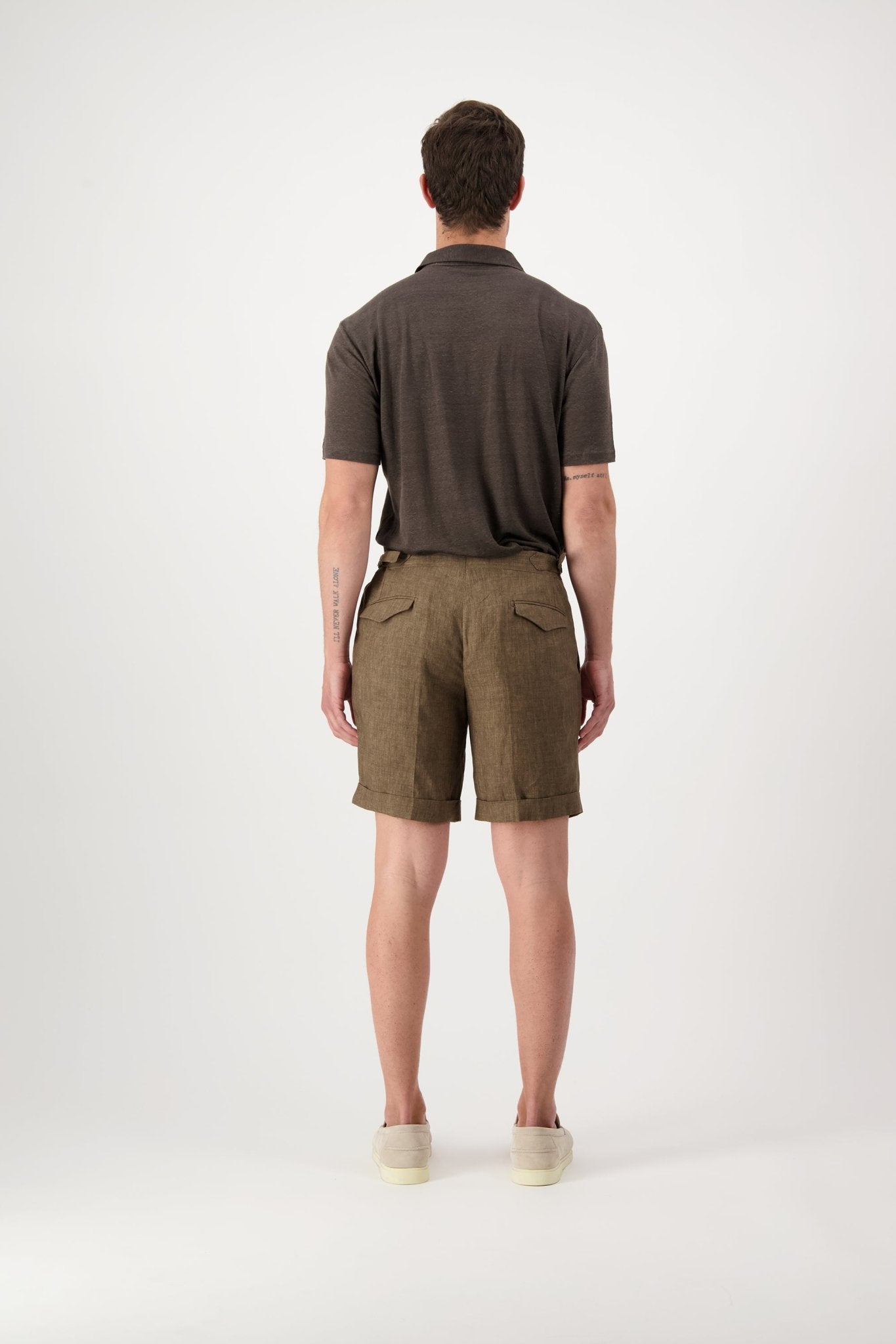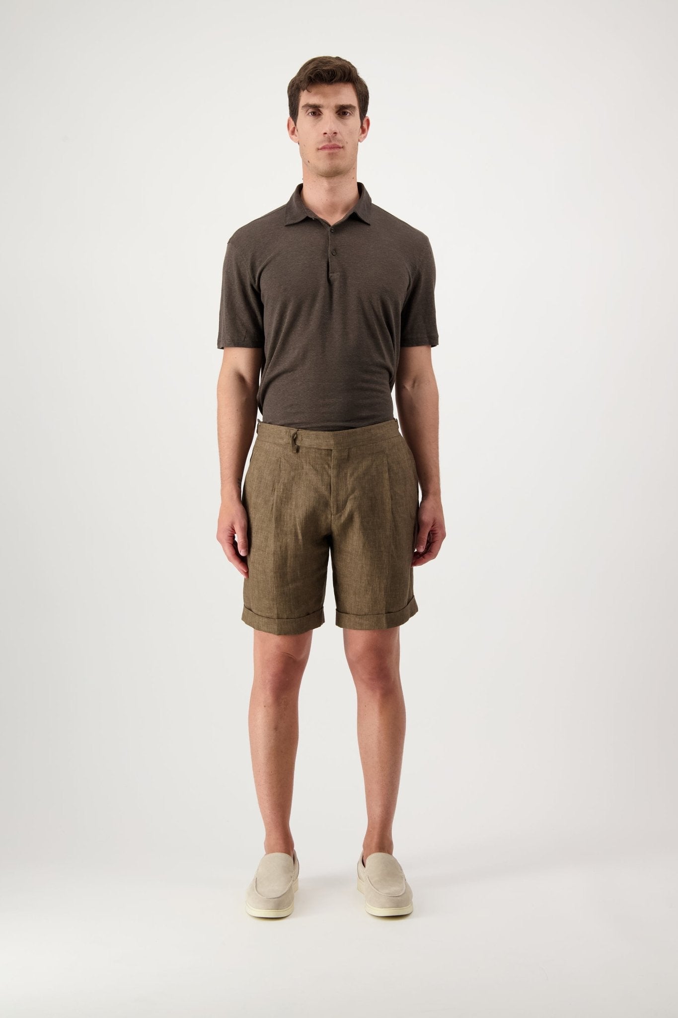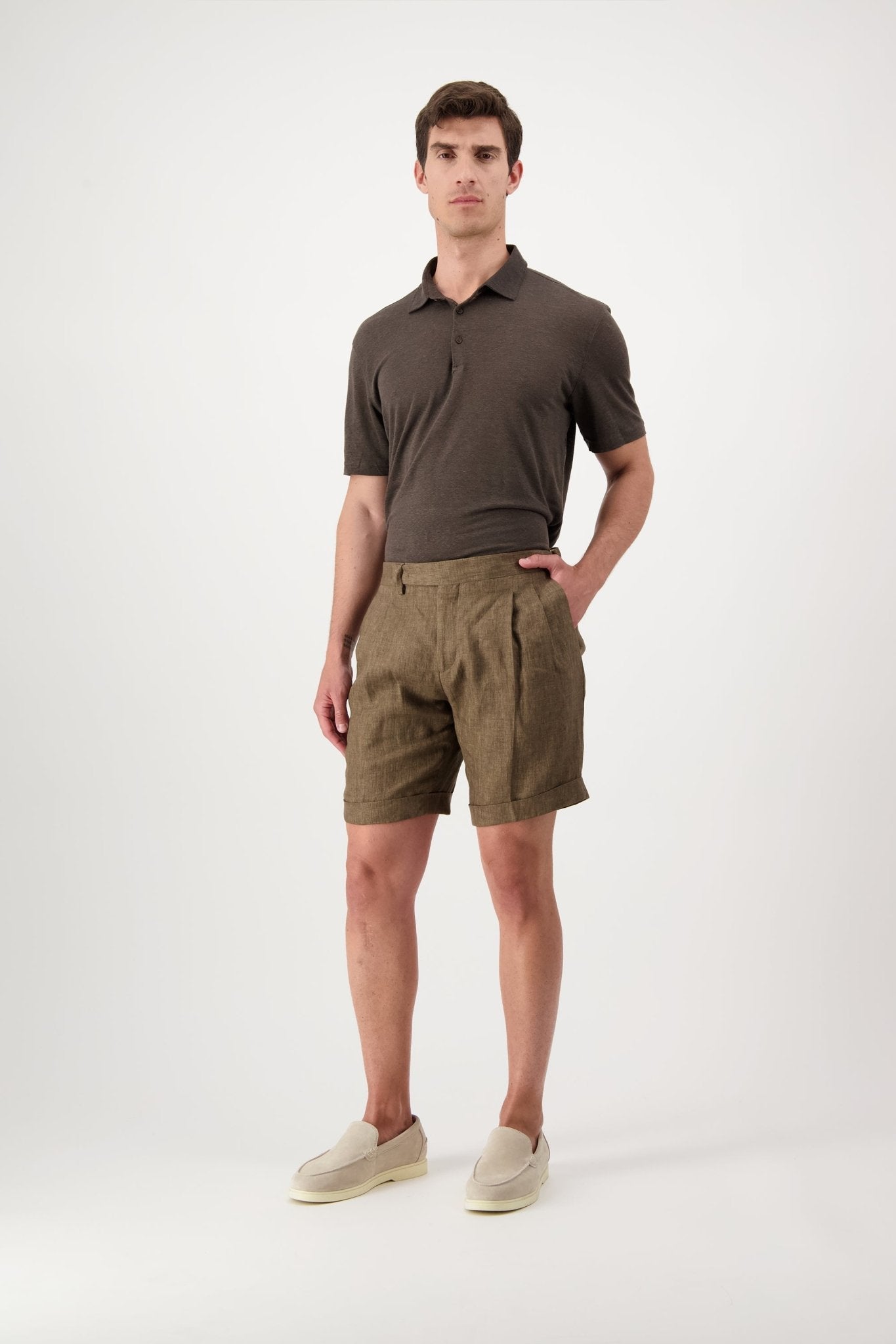 Linen shorts with slant pockets and zip closure. The model is 188 cm tall and wears a size 50.