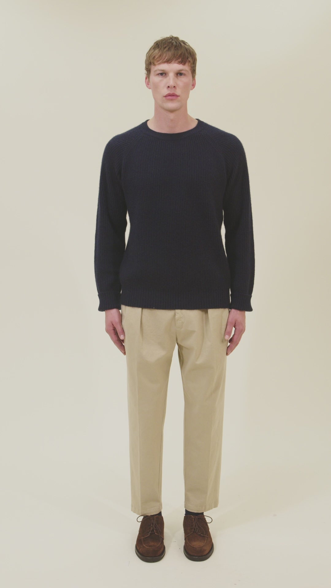 Crew neck sweater in English rib with raglan sleeves. Gauge 7 - 2 ply.