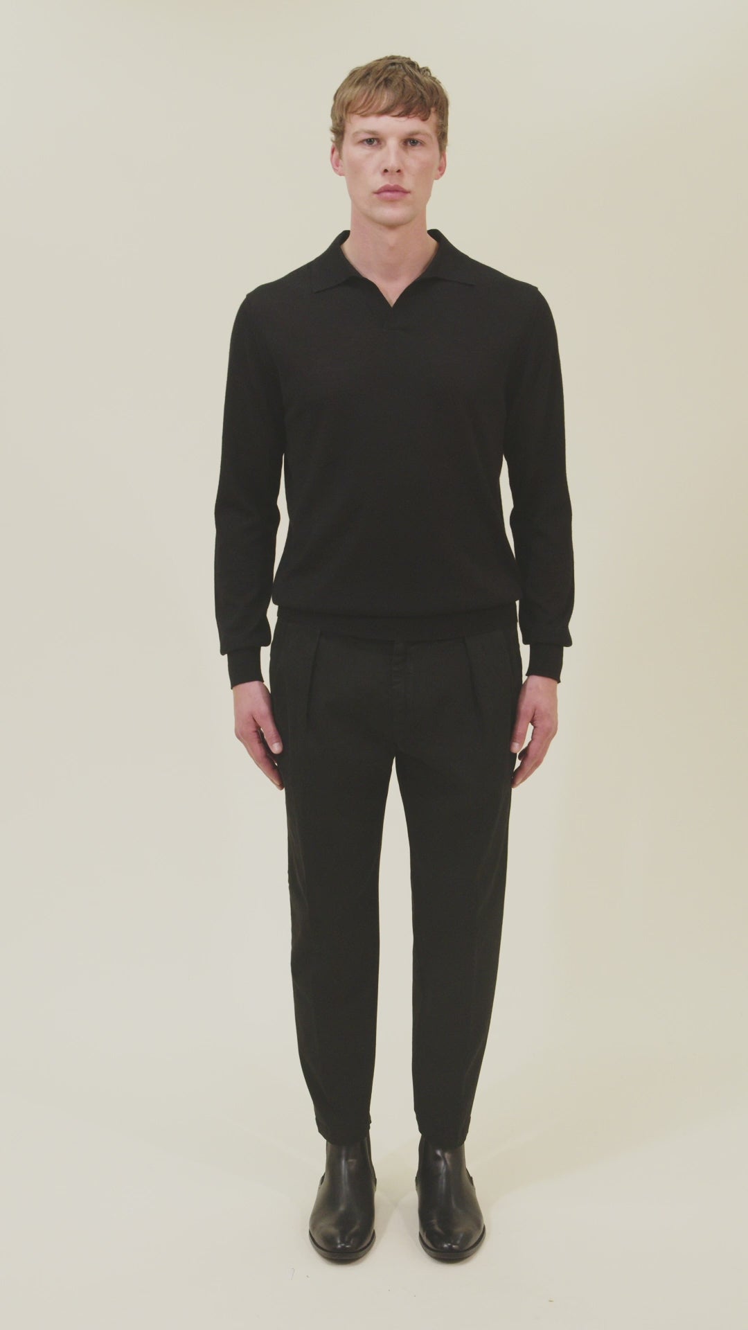 Gabardine trousers with front pleats and elasticated sides for added comfort. Zip fastening and slant pockets. The model is 185 cm tall and wears a size 46.