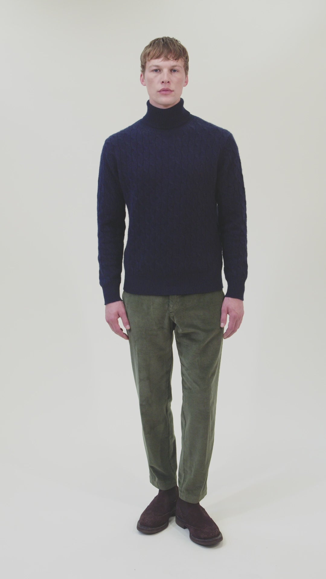 Turtleneck sweater with cable knit. Gauge 7 - 2 ply. The model is 185 cm tall and wears a size L.
