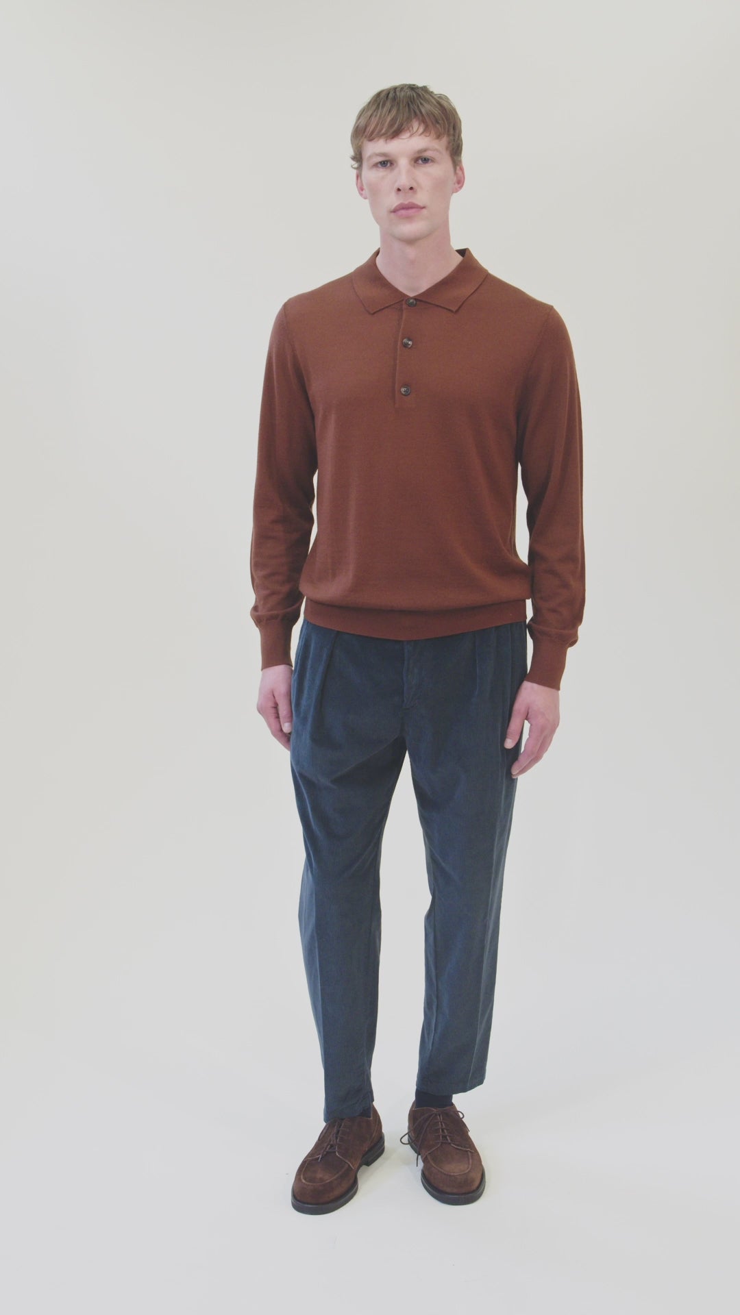 Elegantly crafted polo sweater in 16 gauge merino wool with three-button placket.