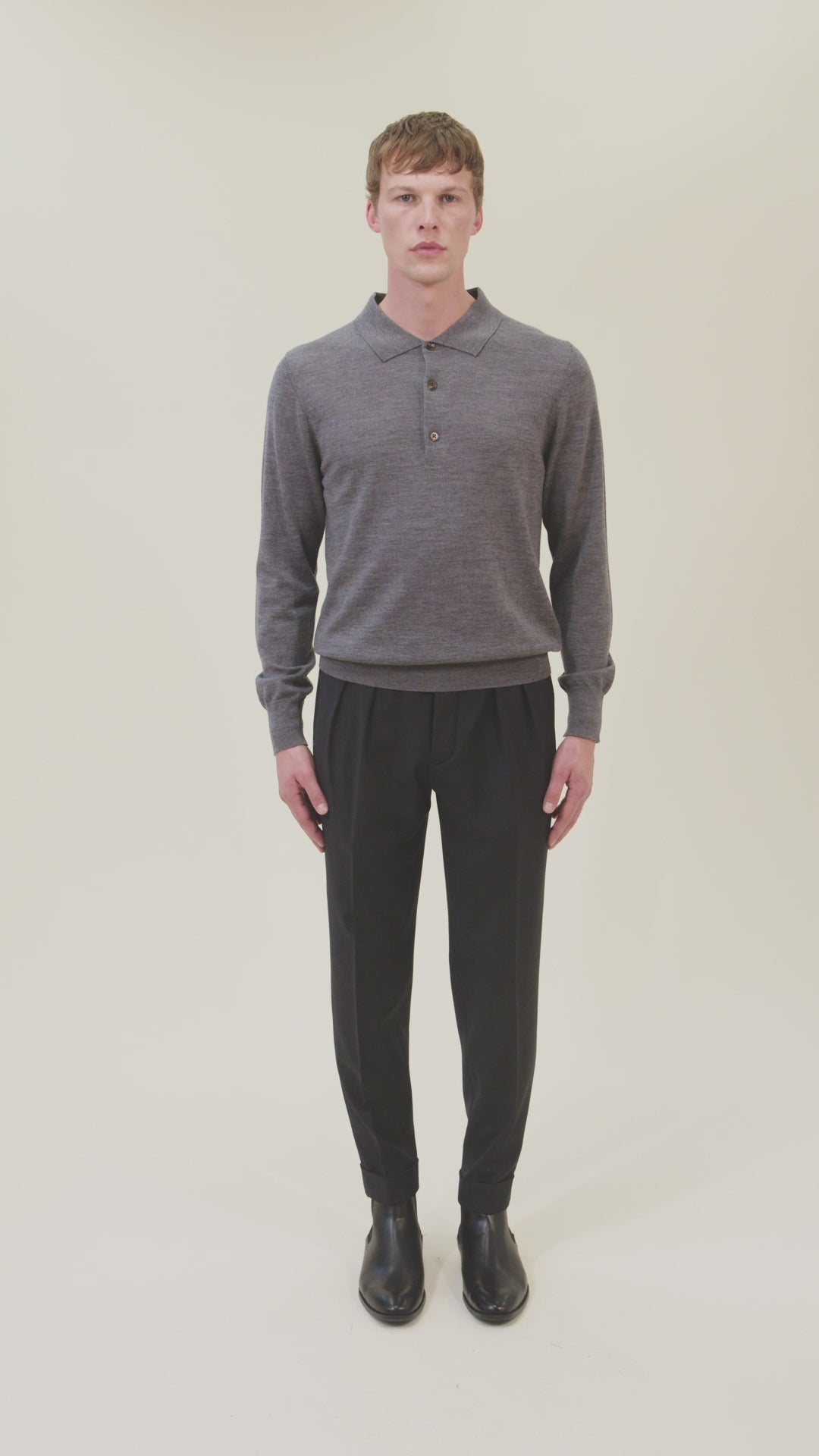 Elegant 16-gauge plain-knit polo shirt made from premium merino wool with a refined three-button closure. This piece is shown on a 185 cm model wearing a size L, with measurements of 95 cm at the chest, 82 cm at the waist, and 92 cm at the hips, offering a precise guide to the fit of this sophisticated men's wardrobe essential.