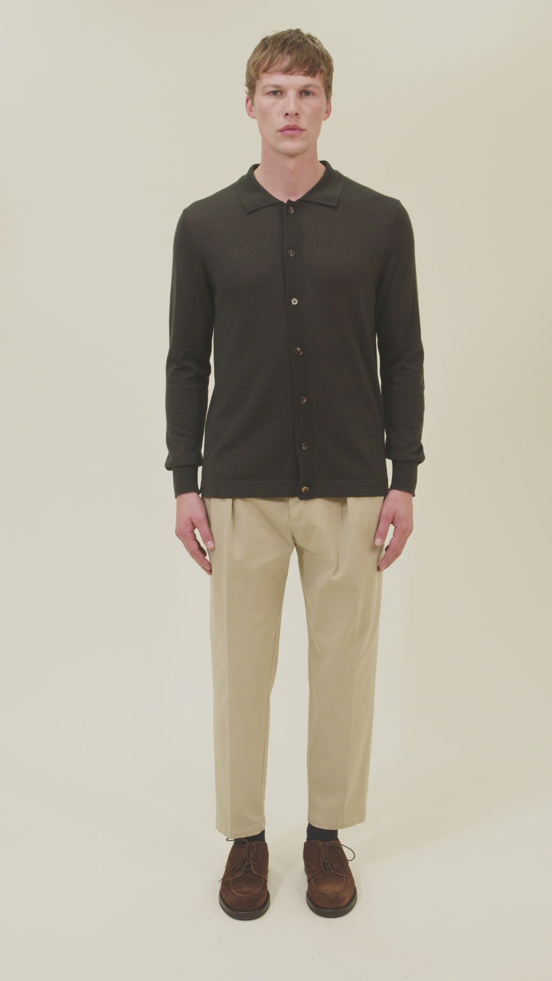 Elegant shirt-style cardigan crafted from smooth 16-gauge merino wool, featuring a seven-button placket. Our model, 185 cm tall, wears a size L and measures a 95 cm chest, 82 cm waist, and 92 cm hips.