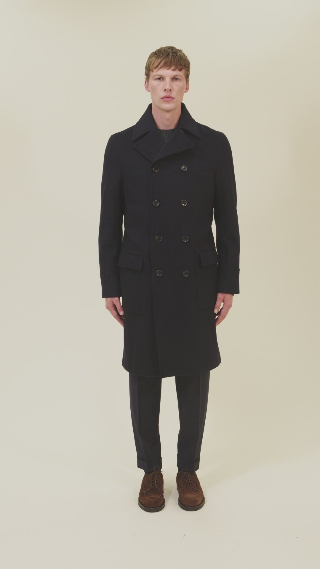 The refined Nicholson double-breasted coat features elegant notched lapels crafted from fine virgin wool from Lanificio Colombo. It stands out for its martingale belt on the back and sophisticated flap pockets.