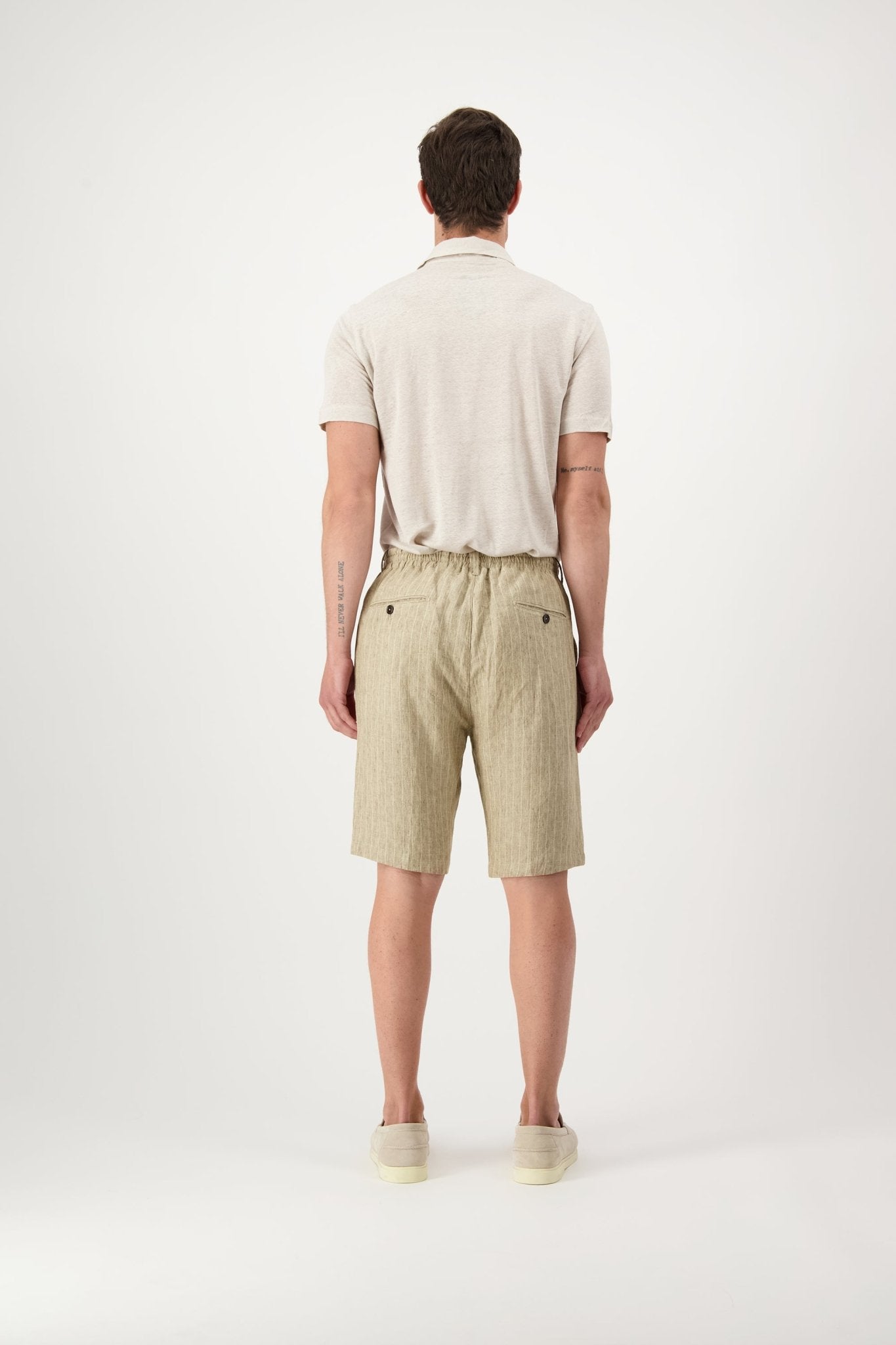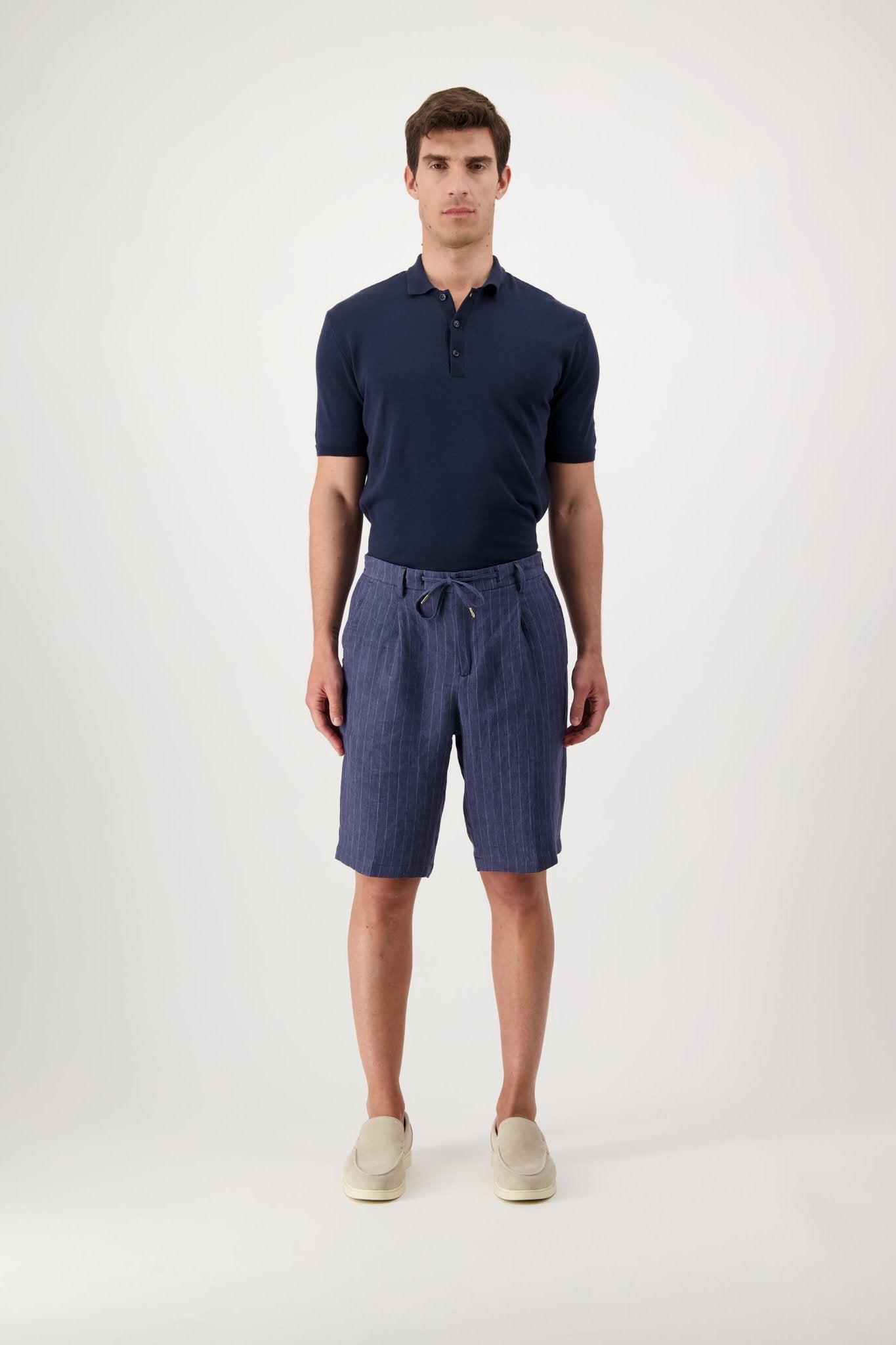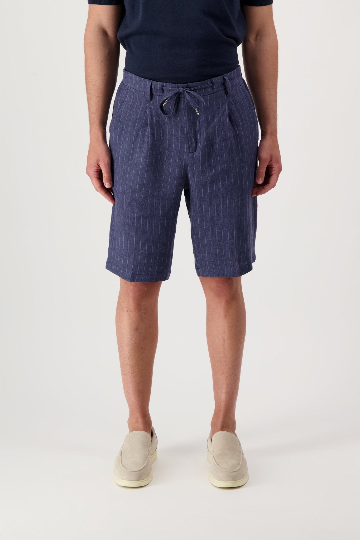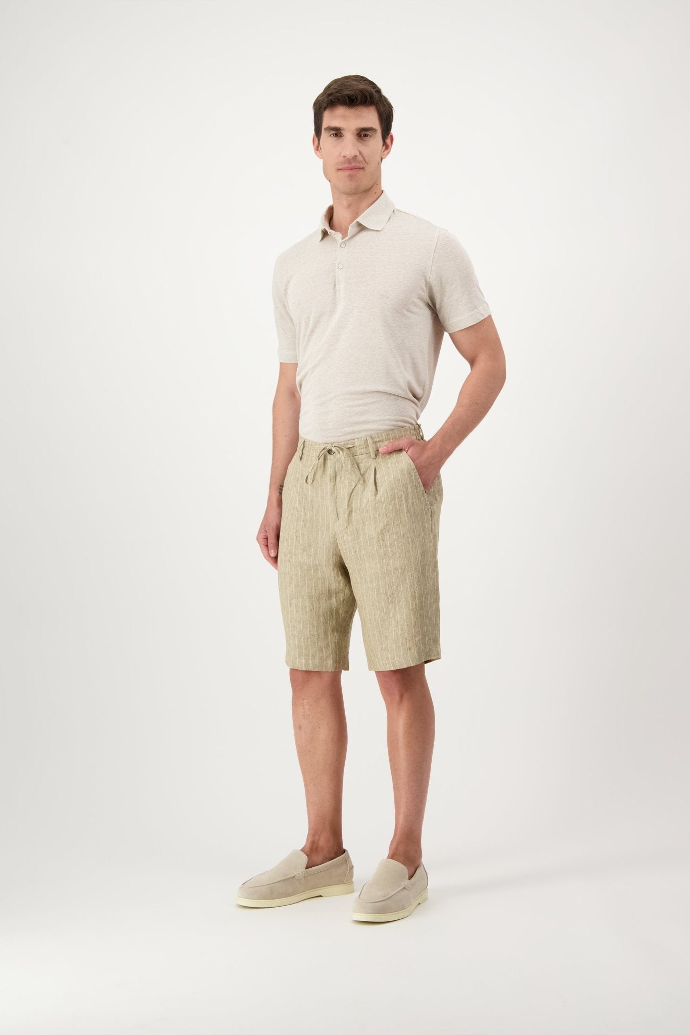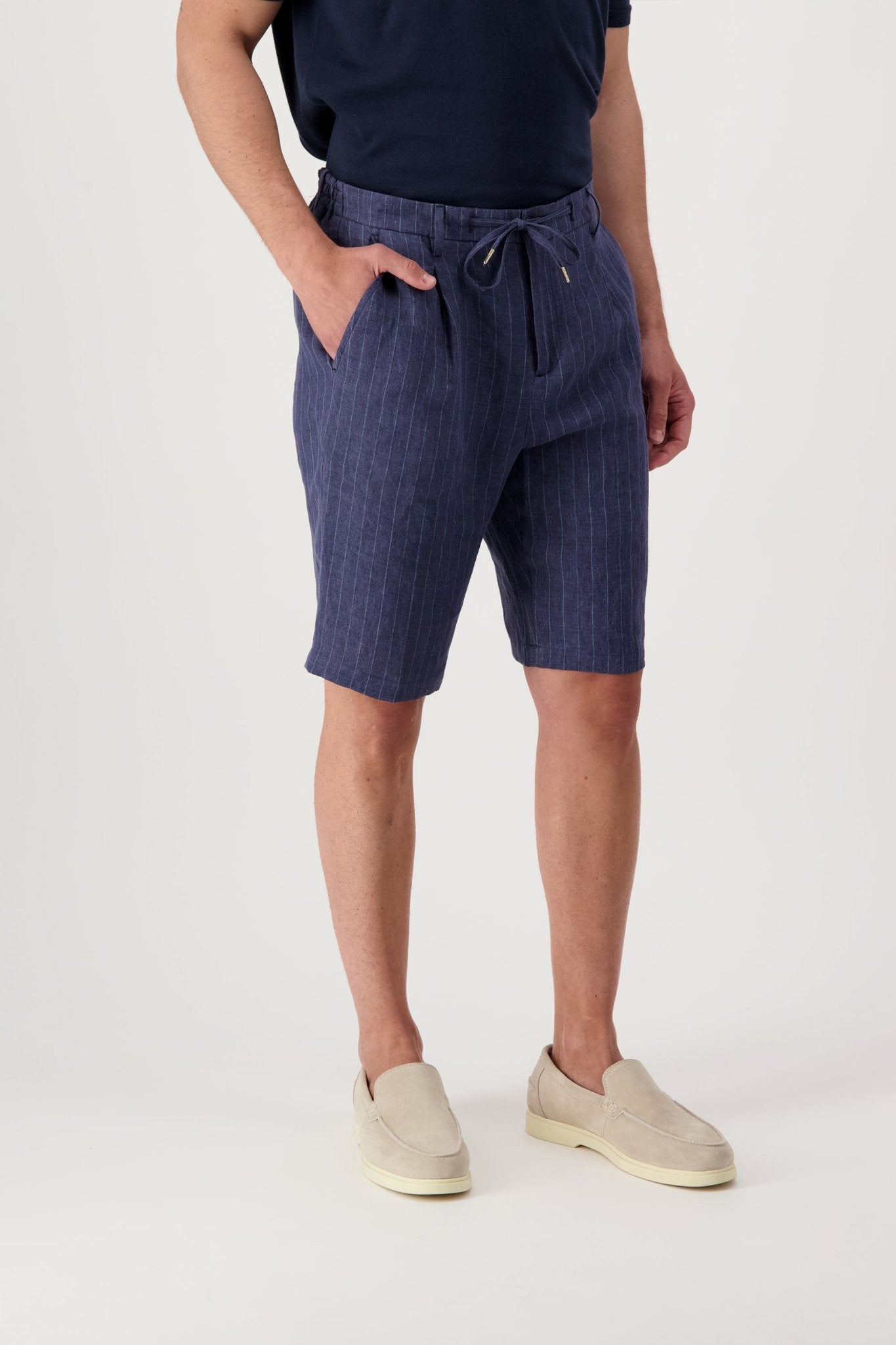 Linen shorts with slant pockets and zip closure. The model is 188 cm tall and wears a size 50.